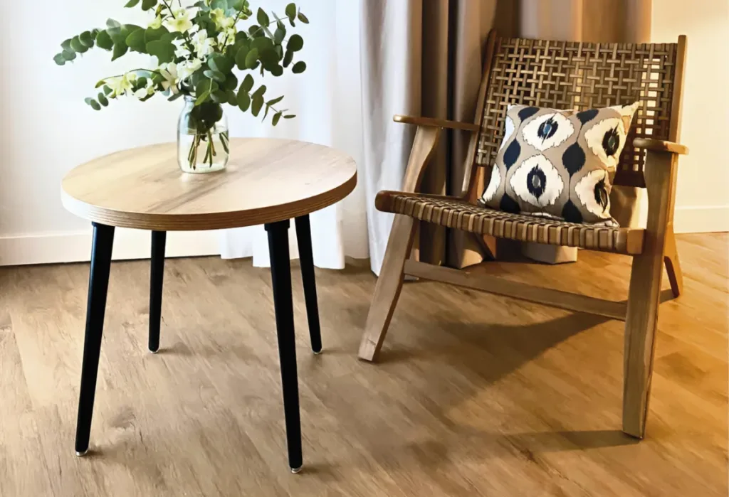 Ofrece una sensación al pisar similar a la de un suelo cerámico o de piedra, pero con la calidez del vinilo.