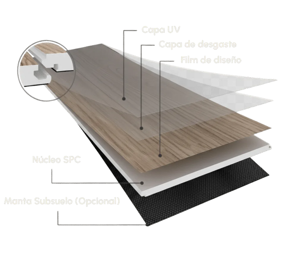 Los suelos vinÃlicos SPC (Stone Plastic Composite) son una solución de última generación con un núcleo ultrarresistente. Esta composición proporciona una estabilidad dimensional excepcional y una resistencia superior, ideal para zonas de alto tráfico.